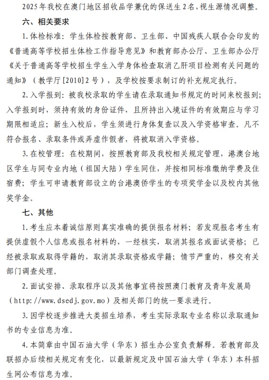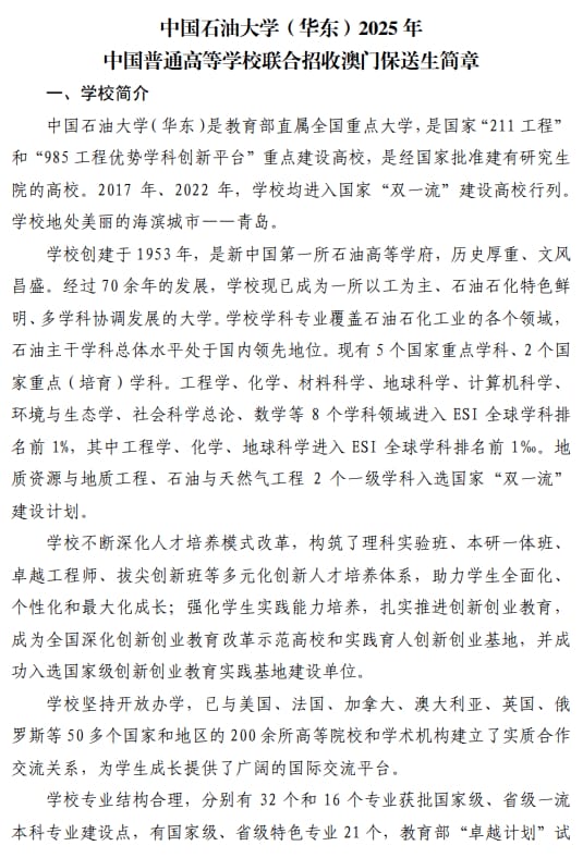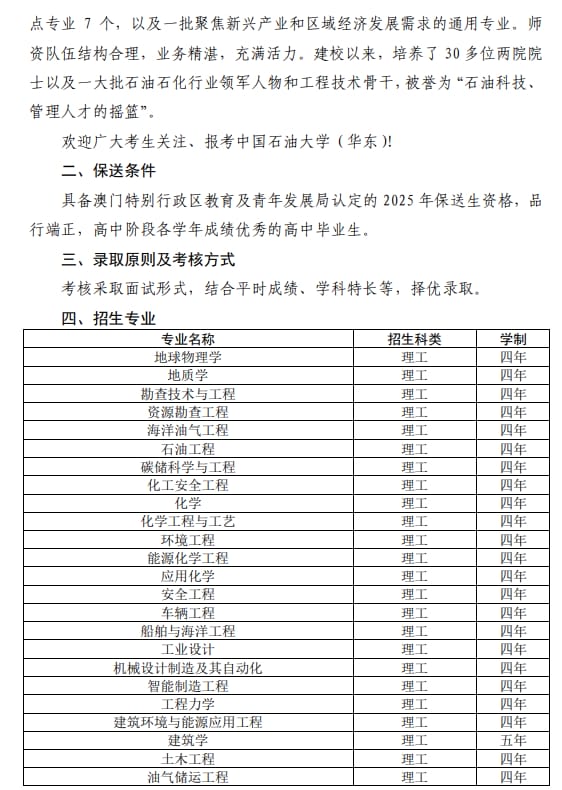 中国石油大学(华东)2025年招收澳门地区保送生简章